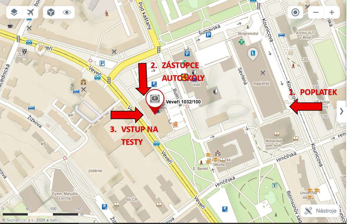 • Následně se přesunete do budovy Veveří 100 (nový parkovací dům), kde se před vchodem do budovy potkáte se zástupcem autoškoly, který Vám předá dokumenty potřebné pro zkoušku. V 7:30 hod. začíná zkouška z testů. (Nestačí přijít v 7:30 hod., zkušební komisař na nikoho nečeká, pokud absolvent autoškoly nemá při zahájení zkoušky z testů vše vyřízeno, tak již není ke zkoušce připuštěn!!!)